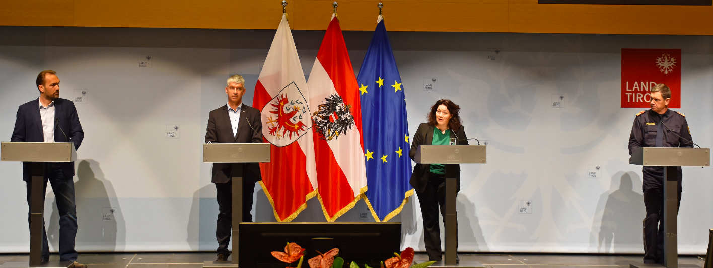 Gemeinsam mit (v. links) Studien-Co-Autor David Schnaiter, Christoph Lechner und dem Leiter der Landesverkehrsabteilung, Markus Widmann, präsentierte Ingrid Felipe im Rahmen einer Pressekonferenz die Ergebnisse der Studie zur Wirksamkeit der Fahrverbote für laute Motorräder im Bezirk Reutte.
