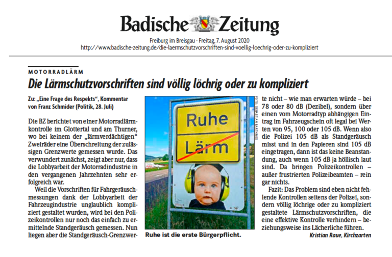 Vorsicht, Realsatire: „Motorradfahrer können die Pest sein. Sie sehen aus wie Ledersitze in der Midlife-Crisis. Und vor allem machen sie Krach. So ein lauter, knatternder Auspuff, der gehört zum Sommer einfach dazu. Leider.“ Schöne Zusammenstellung von Bildern und Rechercheergebnisse der vergangenen Jahre. Hier zum Nachsehen auf Youtube (mit lesenswerten Youtube-Kommentaren der Biker-Elite darunter). Nachsatz: Bayern bekommt jetzt vielleicht einen Motorradbeauftragten, deshalb sehen die Organisatoren der Biker-Demos von weiteren Demos ab. Nachsatz: Einen Lärmschutzbeauftragten hat Bayern nicht.