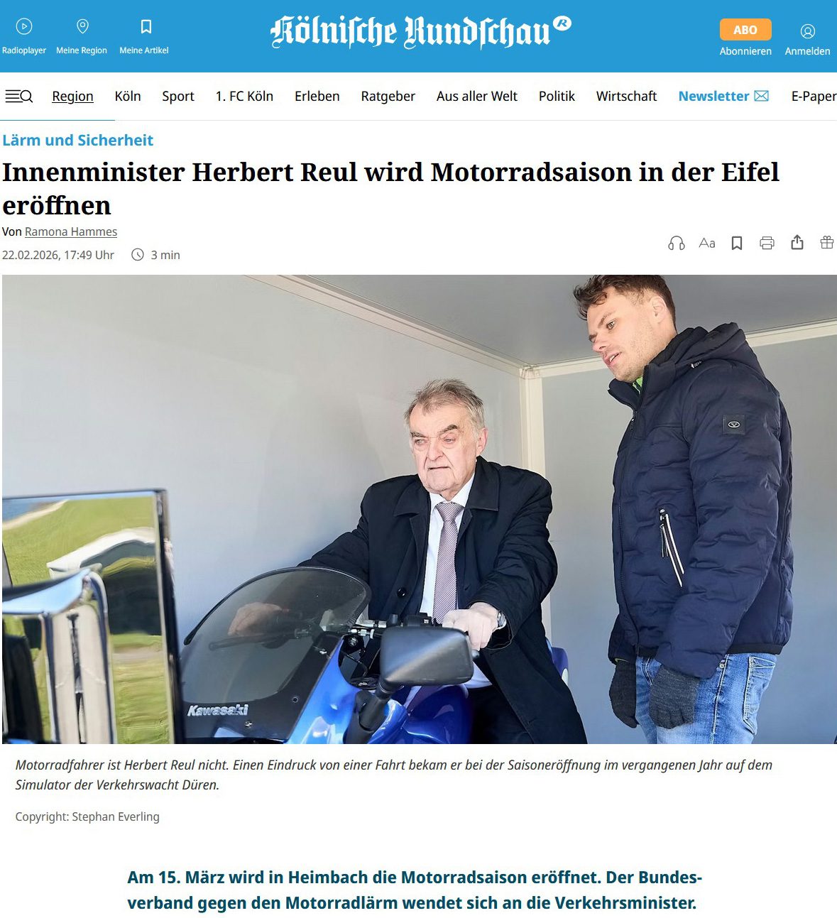 Anlässlich der bevorstehenden Verkehrsministerkonferenz (VMK) und im Angesicht der kurz bevorstehenden nächsten Lärmsaison greift die Kölnische Rundschau in ihrer Ausgabe vom 22. Juni 2026 den Antrag des Bundesverbands gegen Motorradlärm auf. Der Verband fordert erneut von der Politik konkrete Maßnahmen zum Schutz der Anwohner vor gesundheitsschädlichem Lärm. Unterstützt wird der Antrag von Marco Schmunkamp, Bürgermeister von Nideggen und Vorsitzender des Vereins „Silent Rider“, sowie Holger Siegel von den Vereinigten Arbeitsgemeinschaften gegen Motorradlärm (VAGM).